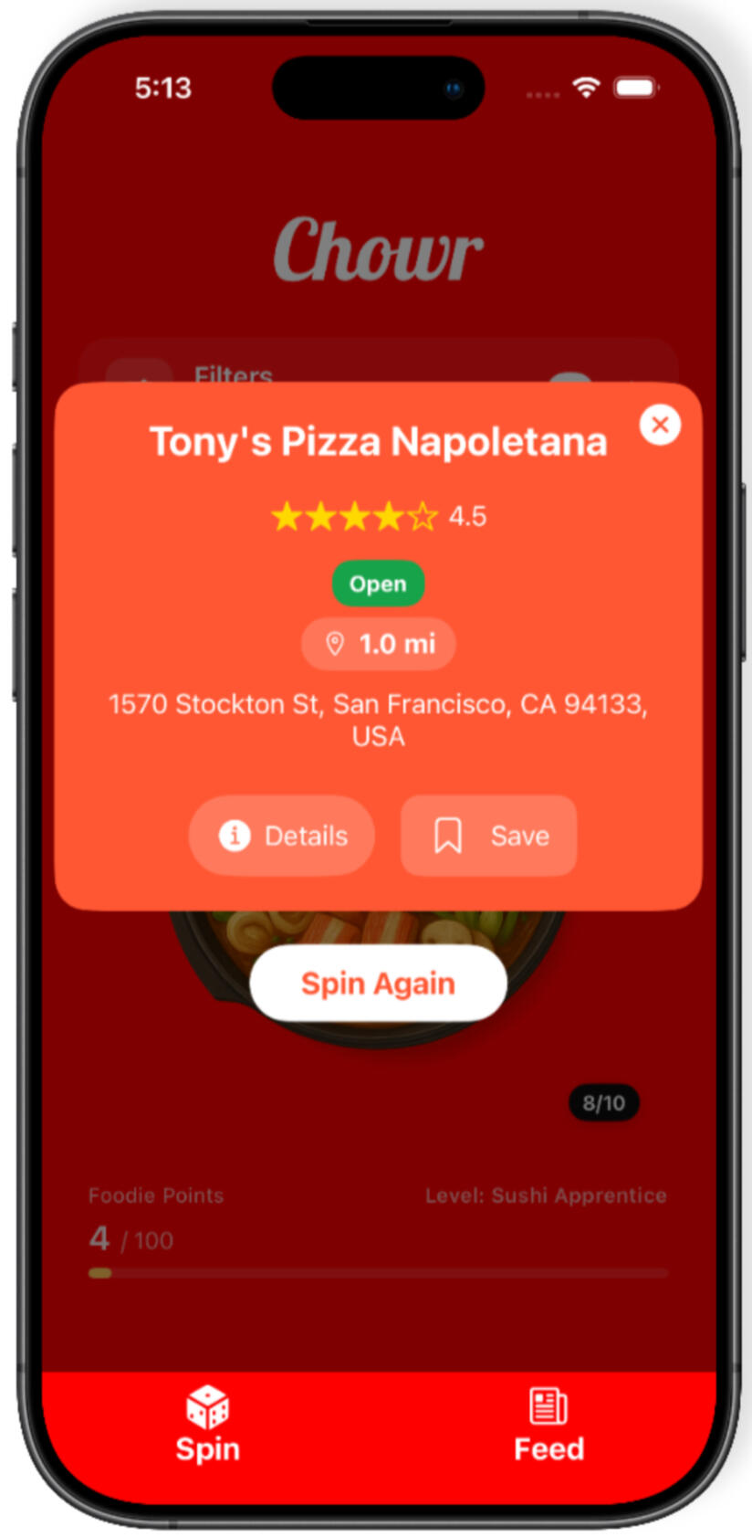 Chowr is a restaurant discovery and social application that helps users find and explore local dining options through a random selection process, view and save restaurants, interact with friends, leave comments and likes, earn foodie points, and receive notifications. We may update, modify, or remove features from time to time as we improve the service.